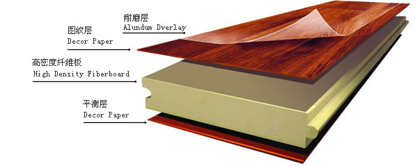 4) 平衡層:厚度約等于耐磨層加裝飾層,起防潮和穩(wěn)定作用,使地板在加工和使用過程中受力均勻。