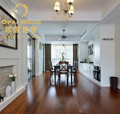 3、效果高檔圓盤豆實木地板顏色深,具光澤,做成深色地板非常高檔,符合中國人的審美觀。