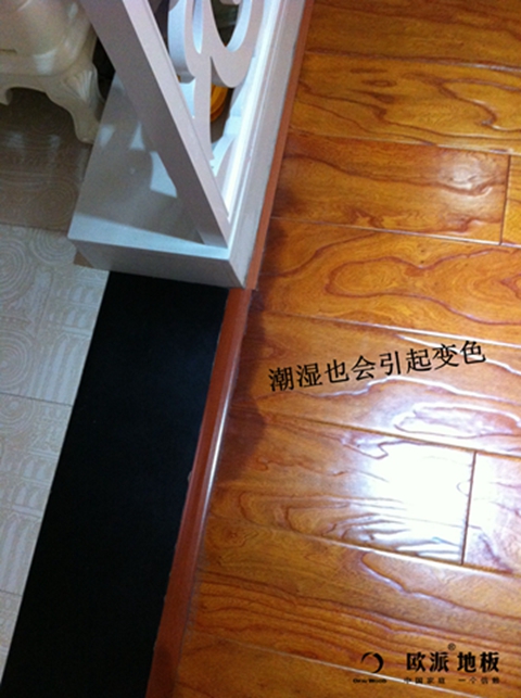 當然說到變色我們不能忘了水這個破壞分子,處于衛生間和廚房等潮濕區,外來潮濕水氣的影響也會導致局部地方地板變色。
